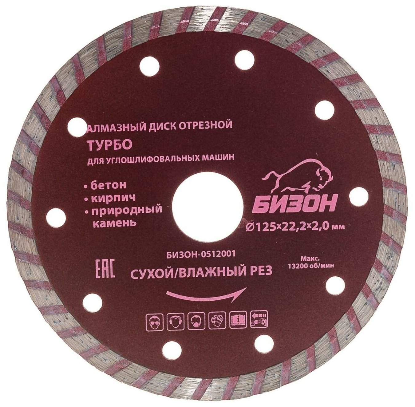 Бизон Диск алмазный отрезной 125*22,2*2,0мм,турбо,сухой/влажный рез,по бетону,кирпичу,камню, уп.карт