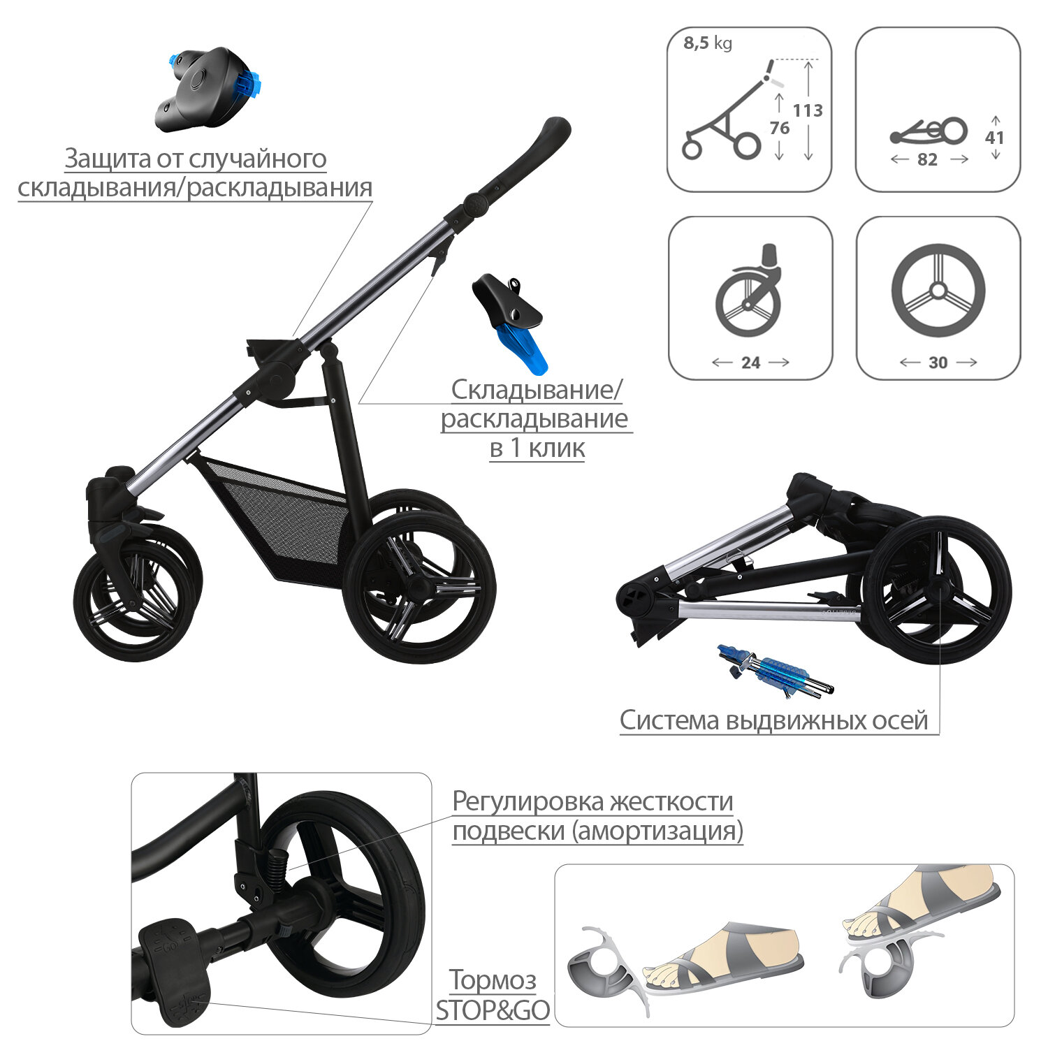 | Минусы: | Нет сумки для мамы и чехлов на колеса |