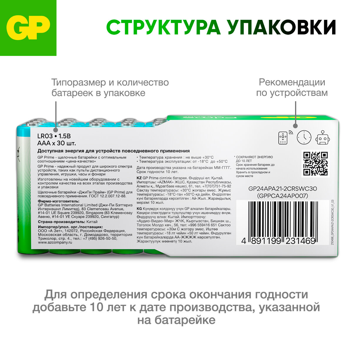 Батарейки GP мизинчиковые ААA LR03 (30 штук в уп) 24A-2CRVS30 796821