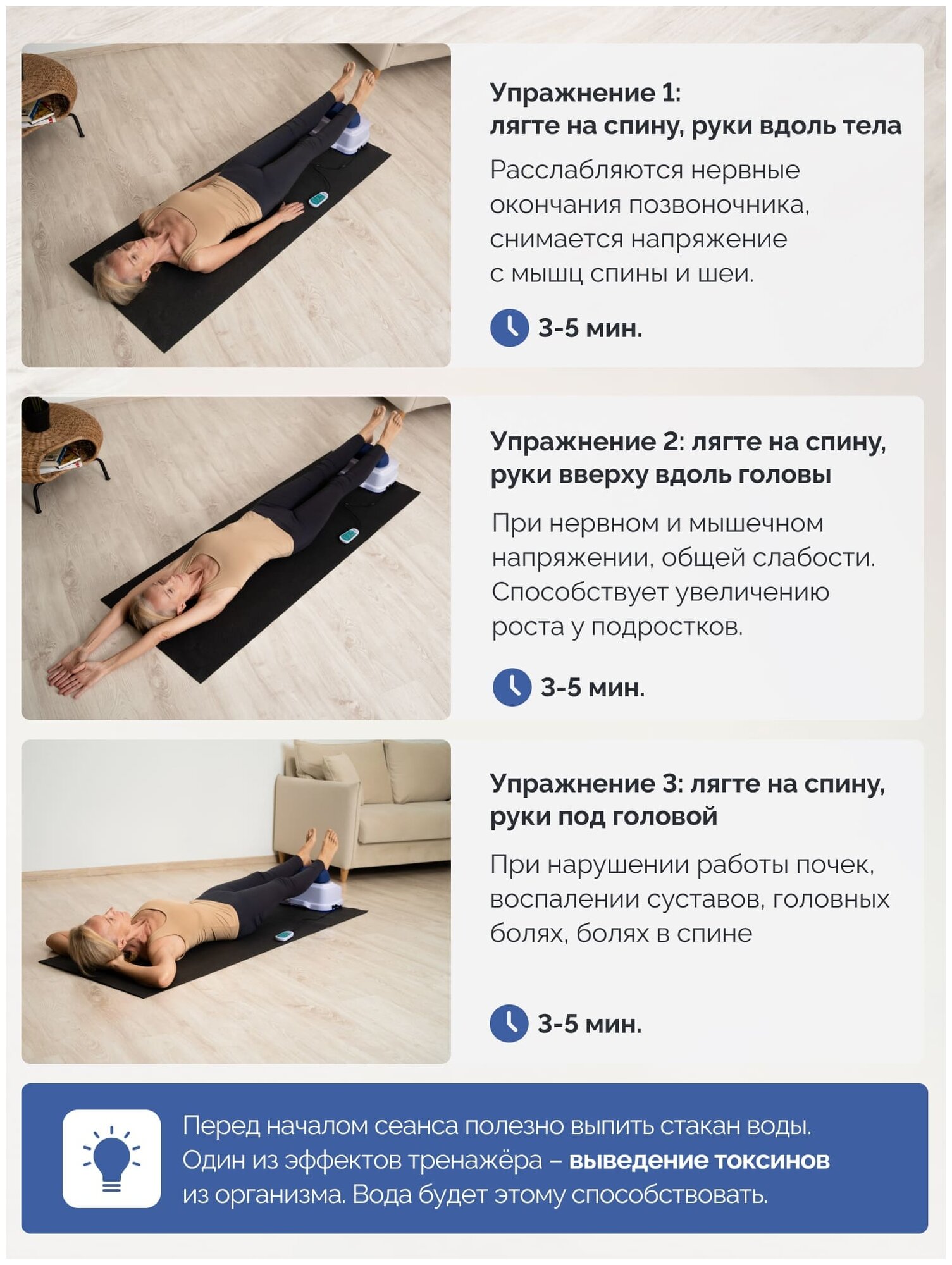 | Плюсы: | Снимает усталость и боль в спине, используется для профилактики остеохондроза. |