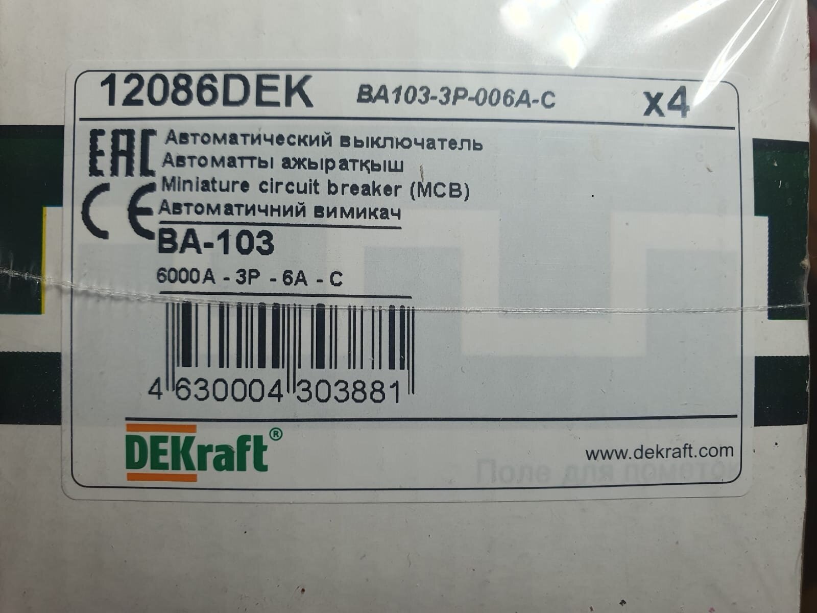4шт. - Выключатель автоматический 3Р 16А х-ка C ВА-103 6кА / Dekraft; арт. 12305DEK; оригинал / - комплект 4шт