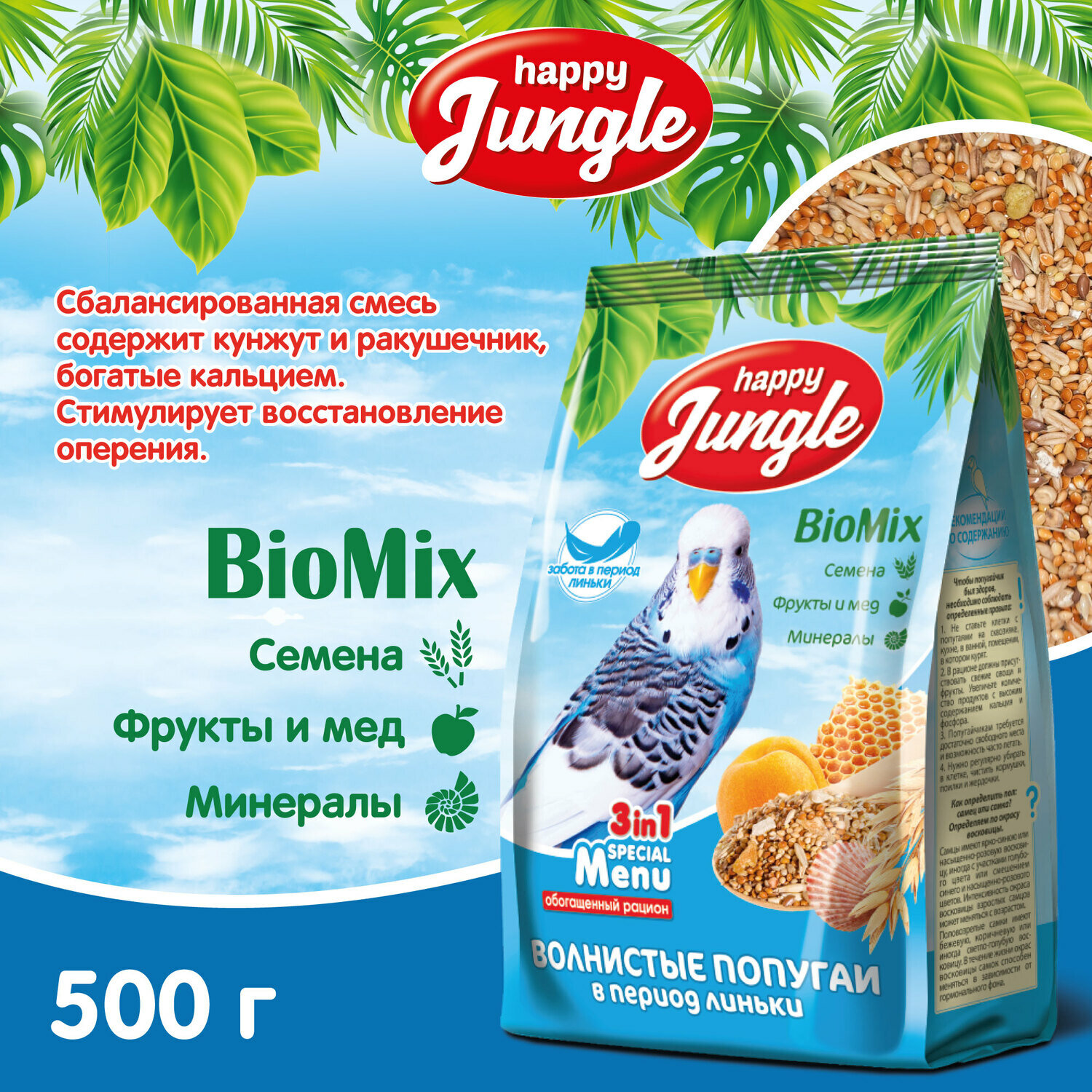 HAPPY JUNGLE Корм для волнистых попугаев при линьке 500г