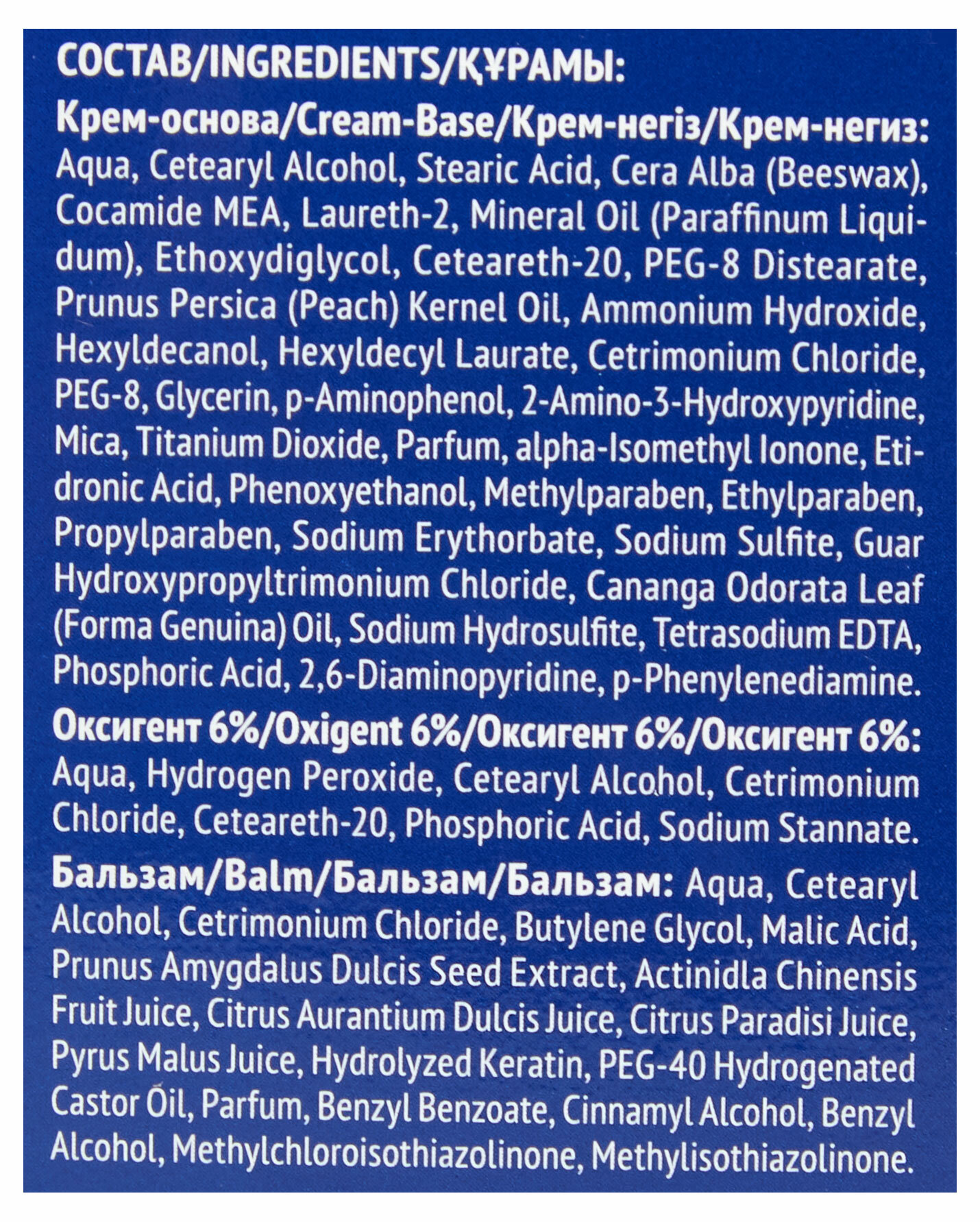 | Состав | Aqua, Cetearyl Alcohol, Stearic Acid, Cera Alba (Beeswax), Cocamide MEA, Laureth-2, Mineral Oil (Paraffinum Liquidum), Ethoxydiglycol, Ceteareth-20, PEG-8 Distearate, Prunus Persica (Peach) Kernel Oil, Ammonium Hydroxide, Hexyldecanol, Hexyldecyl Laurate, Cetrimonium Chloride, PEG-8, Glycerin, Mica, Titanium Dioxide, Parfum, Alpha-Isomethyl Ionone, Etidronic Acid, Phenoxyethanol, Methylparaben, Ethylparaben, Propylparaben, Sodium Erytorbate, Sodium Sulfite, Guar Hydroxypropyltrimonium Chloride, Cananga Odorata Leaf (Forma Genuina) Oil, Sodium Hydrosulfite, Tetrasodium EDTA, Phosphoric Acid, +/-(p-Phenylenediamine, Toluene-2,5-Diamino Sulfate, p-Aminophenol, m-Aminophenol, Resorcinol, 1-Naphthol, 4-Amino-2-Hydroxytoluene, 2-Amino-3-Hydroxypyridine, N,N-Bis(2-Hydroxyethyl)-p-Phenylenediamine Sulfate, 2-Amino-4-Hydroxyethylaminoanisol Sulfate, 1-Hydroxyethyl-4,5-Diaminopyrazol Sulfate, 2,4-Diaminophenoxyethanol HCI, 2,6-Diaminopyridine, 2-Methylresorcinol) |
