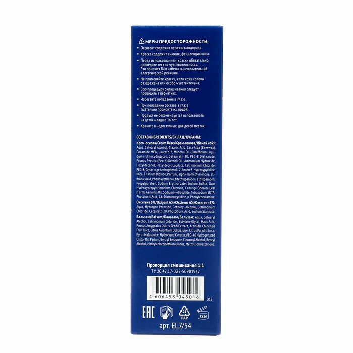 | Дополнительная информация | тест на чувствительности: приготовьте смесь из небольшого количества крем-основы и такого же объёма оксигента, перемешав их в любой неметаллической посуде. Не следует готовить весь объем краски. Нанесите приготовленную смесь на небольшой участок кожи на внутренней стороне локтевого сгиба или за ухом и оставьте на 10-15 минут. Затем смойте. Если в течение суток признаки аллергической реакции не появились, можете использовать краску |