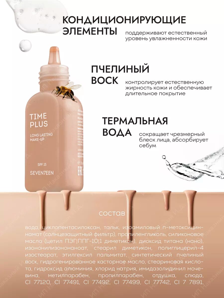 Seventeen / Севентин Тональный крем для лица Time Plus Long Lasting Make-Up для любого типа кожи оттенок 03 Натуральный бежевый с пчелиным воском 35мл