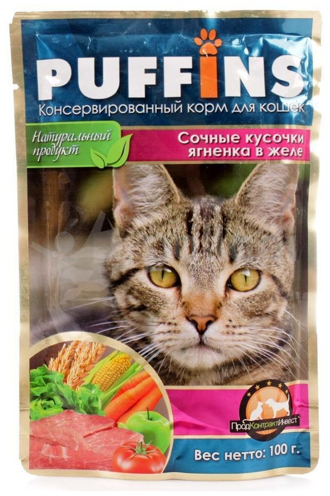 Купить PUFFINS для взрослых кошек сочные кусочки с ягненком в желе (100 гр х 24 шт)