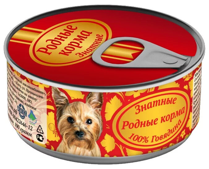 Родные Корма консервы для собак знатные, говядина для собак 100 % , 100 г
