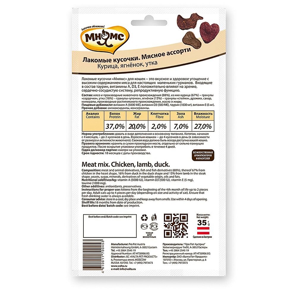 Ниже Вы можете прочитать отзывы на Мнямс лакомые кусочки мясное ассорти для кошек 35 г., ознакомится с подробными характеристиками, посмотреть интересные обзоры и фотографии на Мнямс лакомые кусочки мясное ассорти для кошек 35 г..