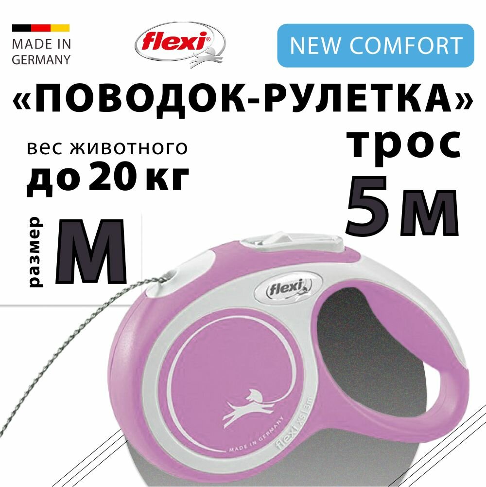 Flexi New Comfort M, рулетка 5м, трос, для собак до 20 кг, цвет розовый