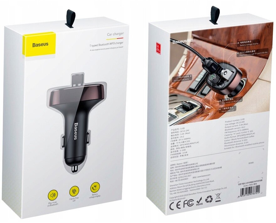 Автомобильное зарядное устройство BASEUS T typed S-09, 2*USB, 3.4A, черный, дисплей + Bluetooth, FM, SD/TF
