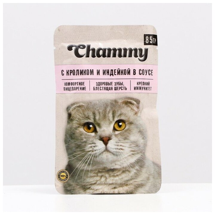 Влажный корм Chammy для кошек, кролик/индейка в соусе, пауч, 85 г интересное:
