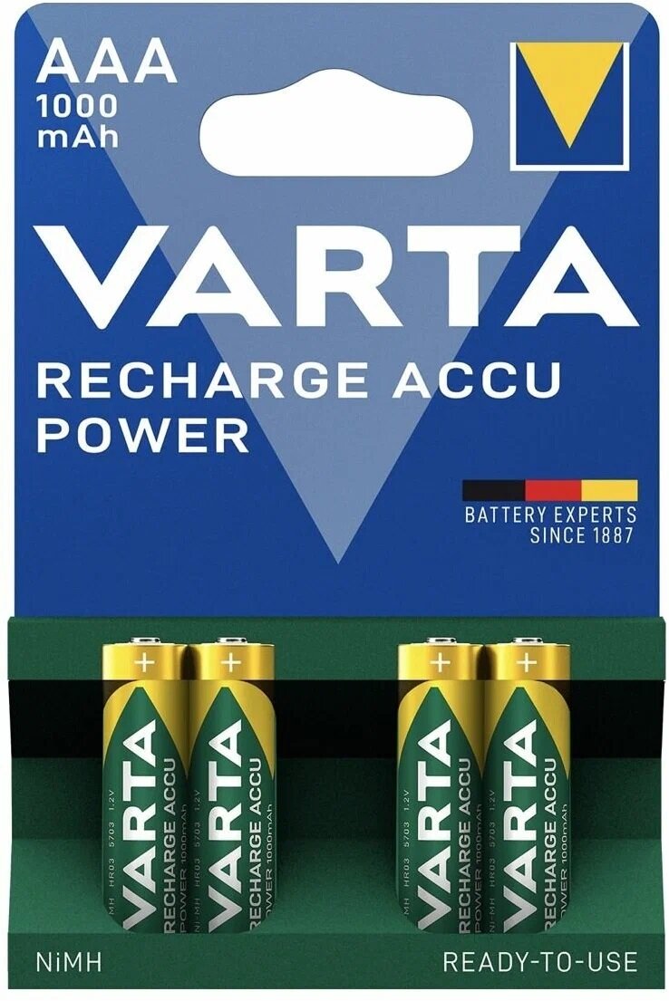 Аккумулятор Ni-Mh 1000 мА·ч 1.2 В VARTA Recharge Accu Power 1000 AAA, в упаковке: 4 шт.