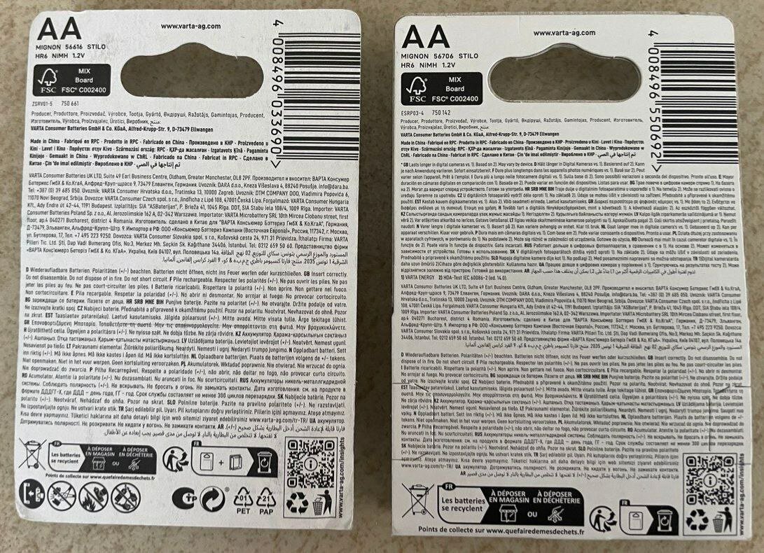 | Минусы: | Заряд держат странно. Приехали не полностью заряженные. Зарядила их на максимум, а на следующий день они опять с двумя полосками заряда. (используются в контроллерах oculus, по идее не должны так быстро терять заряд) Соляные батарейки держались 3 месяца. |
