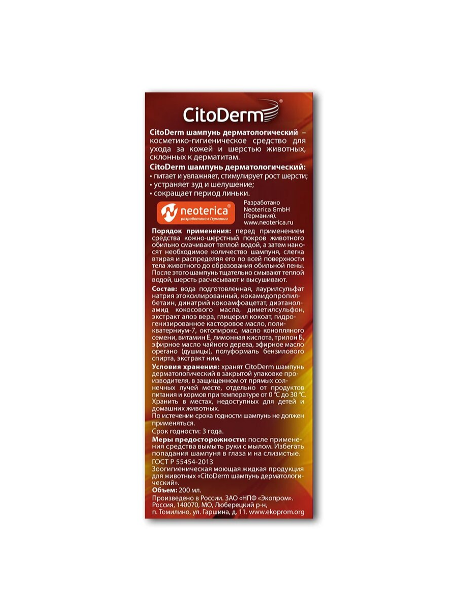 Шампунь дерматологический для комплексного ухода за чувствительной кожей кошек и собак Цитодерм (Neoterica),200мл