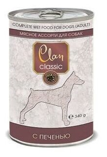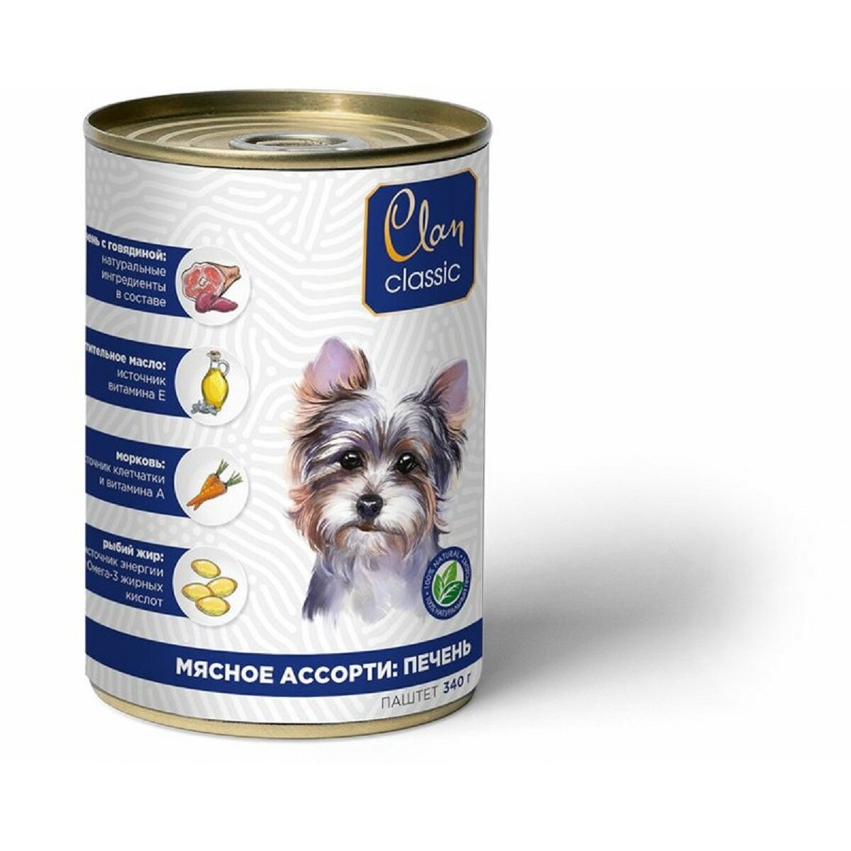 Корм полнорационный консервированный Clan CLASSIC для собак, Мясное ассорти с печенью, 340г, 12 шт.
