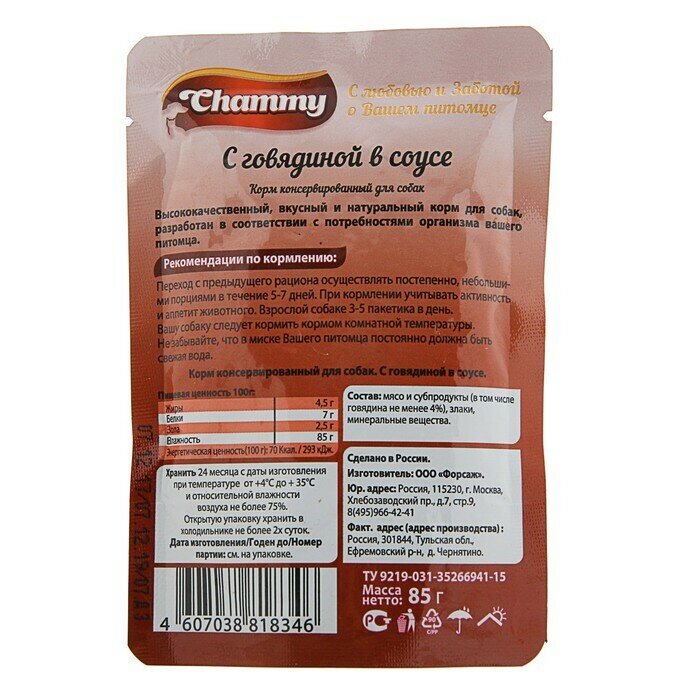 Корм консервированный для собак "Chammy" говядина в соусе, 85гр*24 шт интересное: