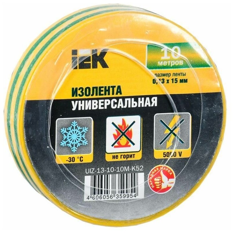 Изолента Iek ПВХ 0.13х15мм (рул.10м) желт./зел., UIZ-13-10-10M-K52