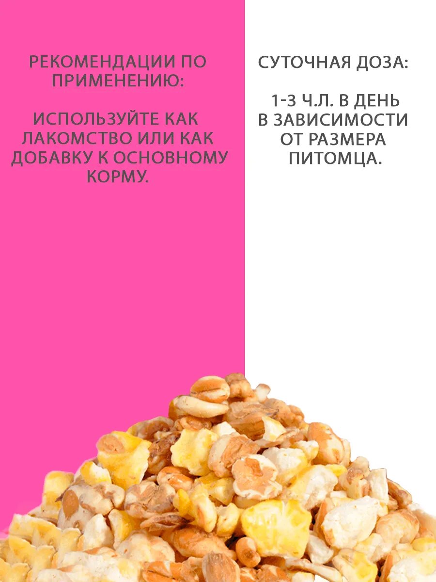 | Плюсы: | Шикарная витаминная добавка для грызунов, легкие хлопья попкорна, взвесь орешков |