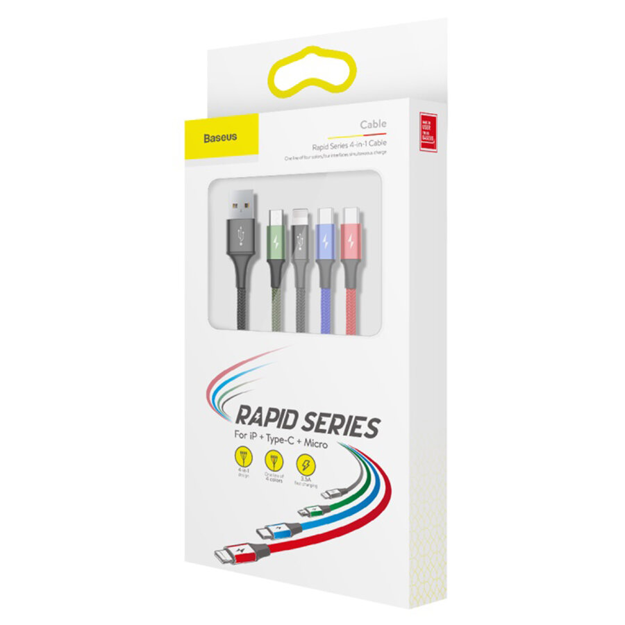 Купить Кабель USB BASEUS Fast 4-in-1, USB - MicroUSB + 2*Type-C + Lightning, 3.5A, 1.2 м, черный