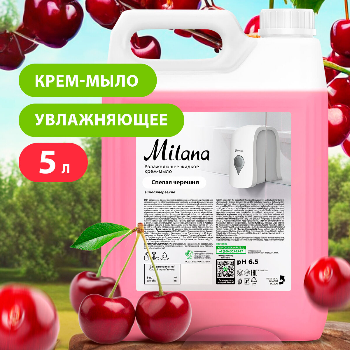 Мыло жидкое увлажняющее Grass Milana Черешня 5литров для рук тела кожи уход за руками крем мыло