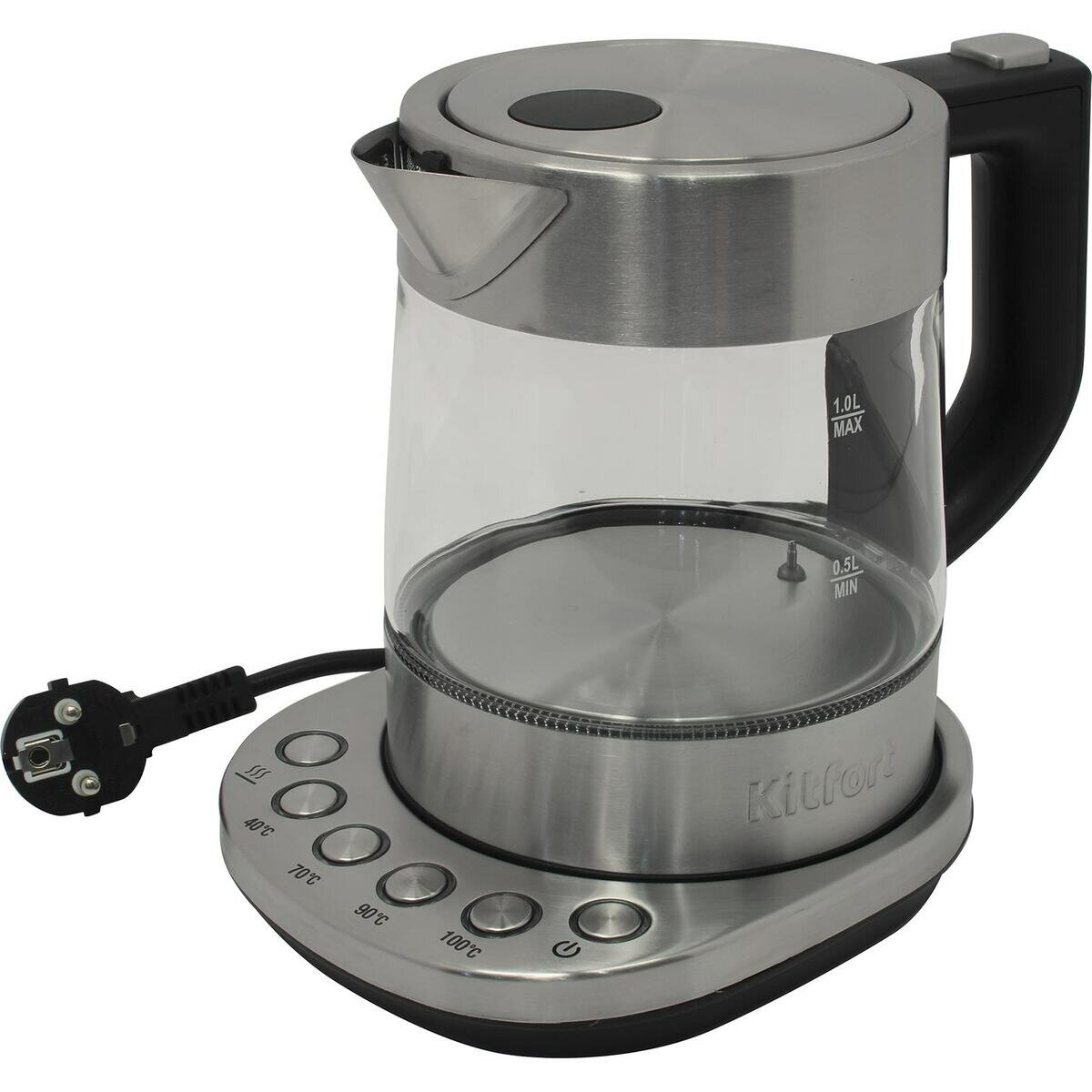 Чайник KITFORT КТ-648, 1 л, 2200 Вт, закрытый нагревательный элемент, терморегулятор, стекло, серебристый