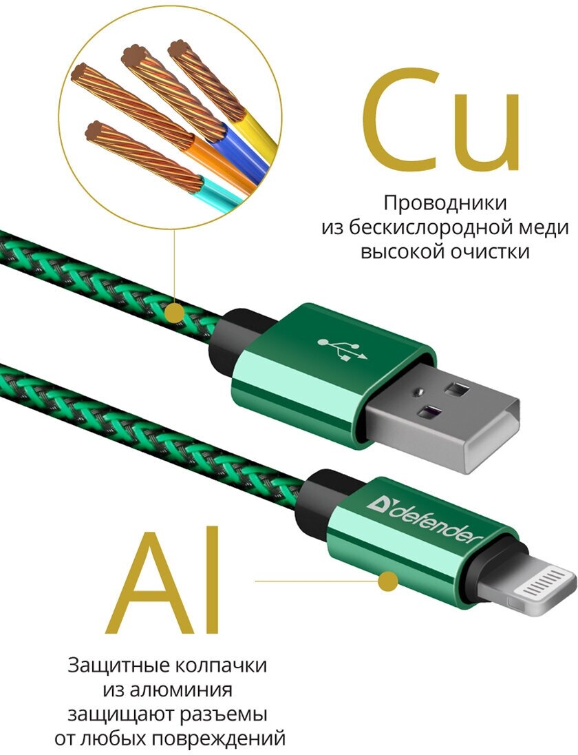 Кабель Lightning 1м Defender ACH01-03T PRO круглый зеленый 87810