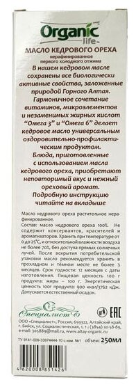 Масло кедрового ореха "Organic", 250 мл, Специалист ООО