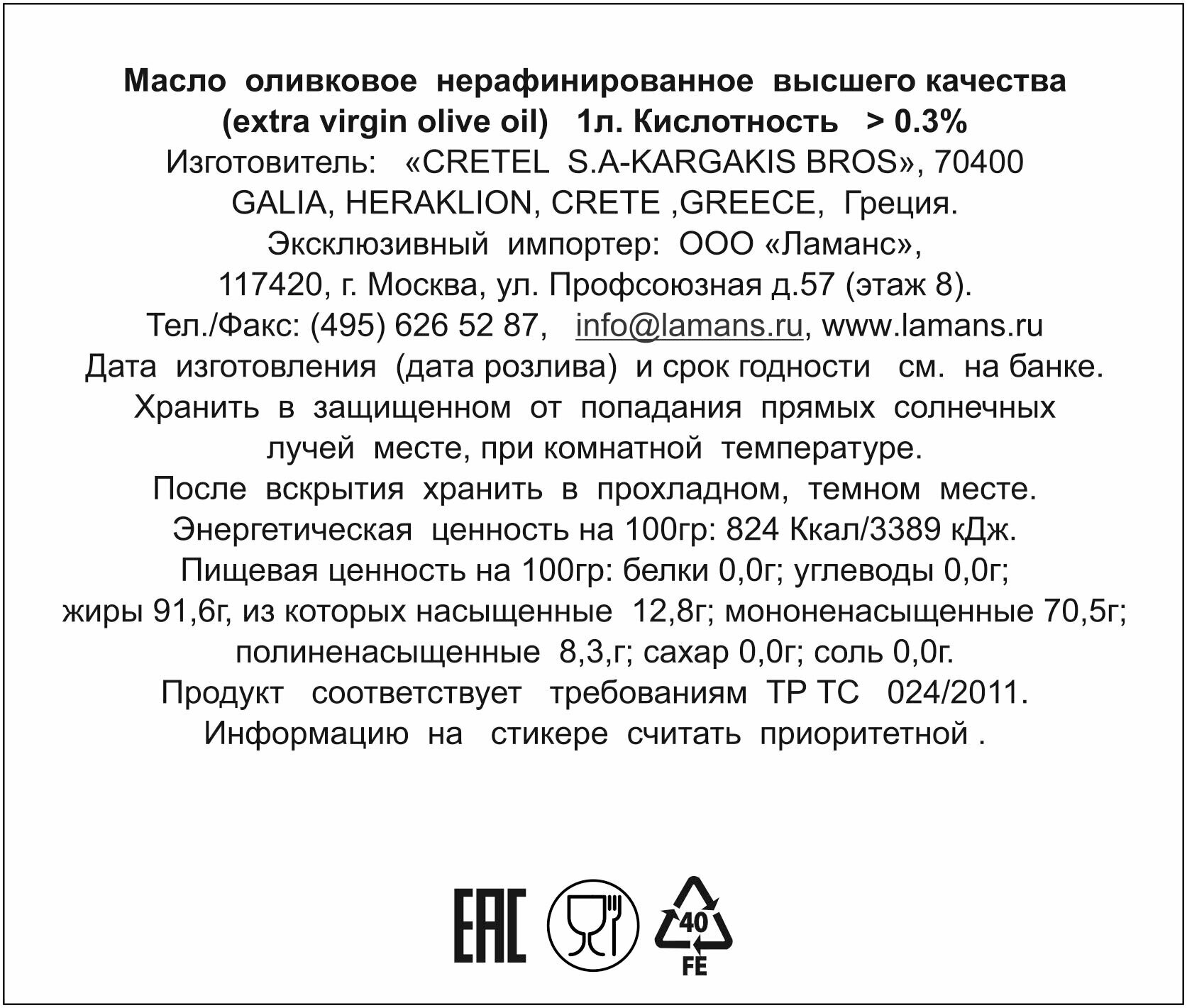 СохранитьОливковое масло первого холодного отжима высшего качества Glafkos Extra Virgin, кислотность 0,3%, ж/б, 1 литр, Греция интересное: