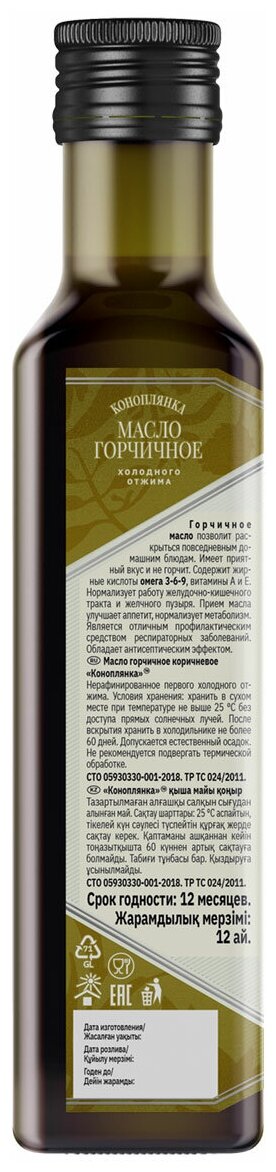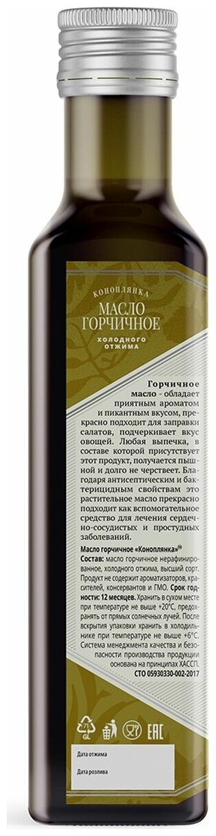 Масло "Коноплянка" горчичное нерафинированное первого холодного отжима, стекло, бутылка 0,25 л интересное: