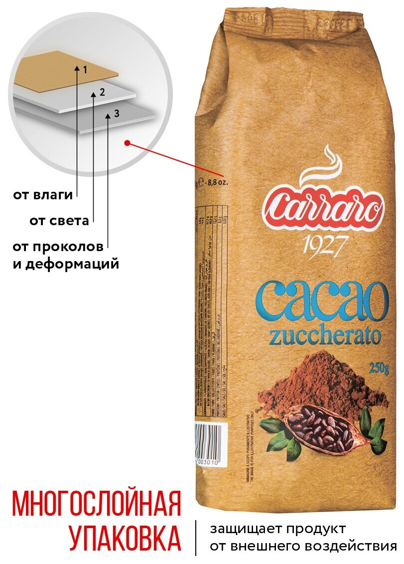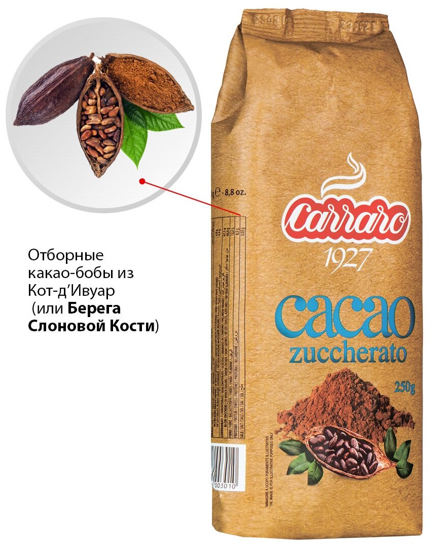 Растворимый какао Carraro Cacao Zuccherato с сахаром, 250 гр. интересное: