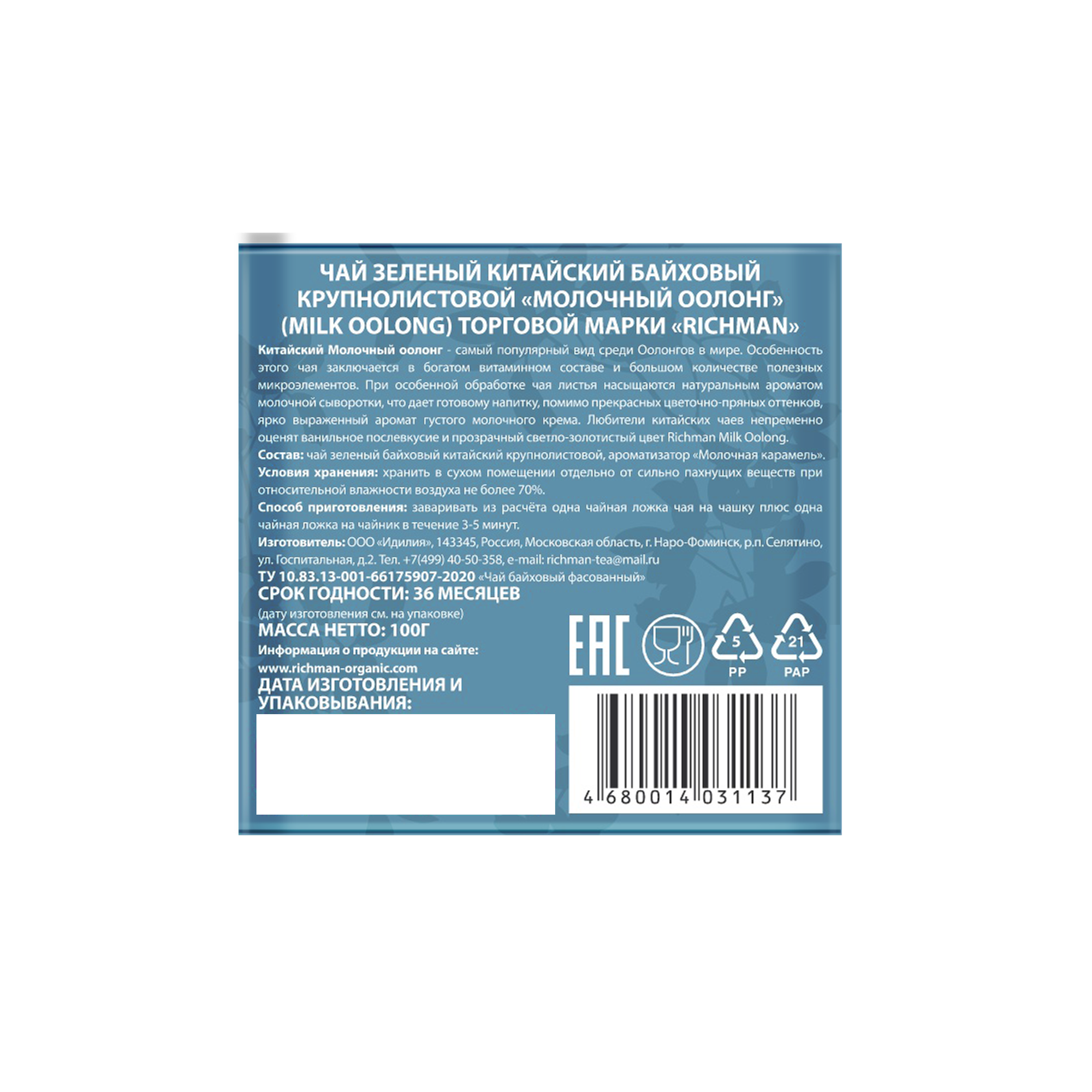 Чай Richman Classic зеленый китайский крупнолистовой, молочный оолонг, 100г китай, картонная коробка интересное: