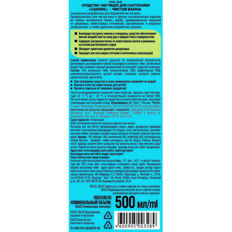 Аист Чистящее средство Санокс чистая ванна 500 мл