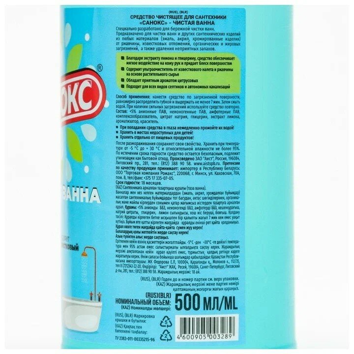 Жидкость Чистая ванна с экстрактом лимона и глицерином санокс, 500 мл, 520 г