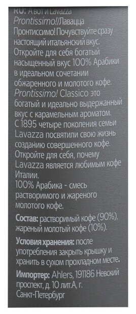 Ниже Вы можете прочитать отзывы на Lavazza Prontissimo Classico 95г кофе растворимый 100% арабика ж/б (5330), ознакомится с подробными характеристиками, посмотреть интересные обзоры и фотографии на Lavazza Prontissimo Classico 95г кофе растворимый 100% арабика ж/б (5330).