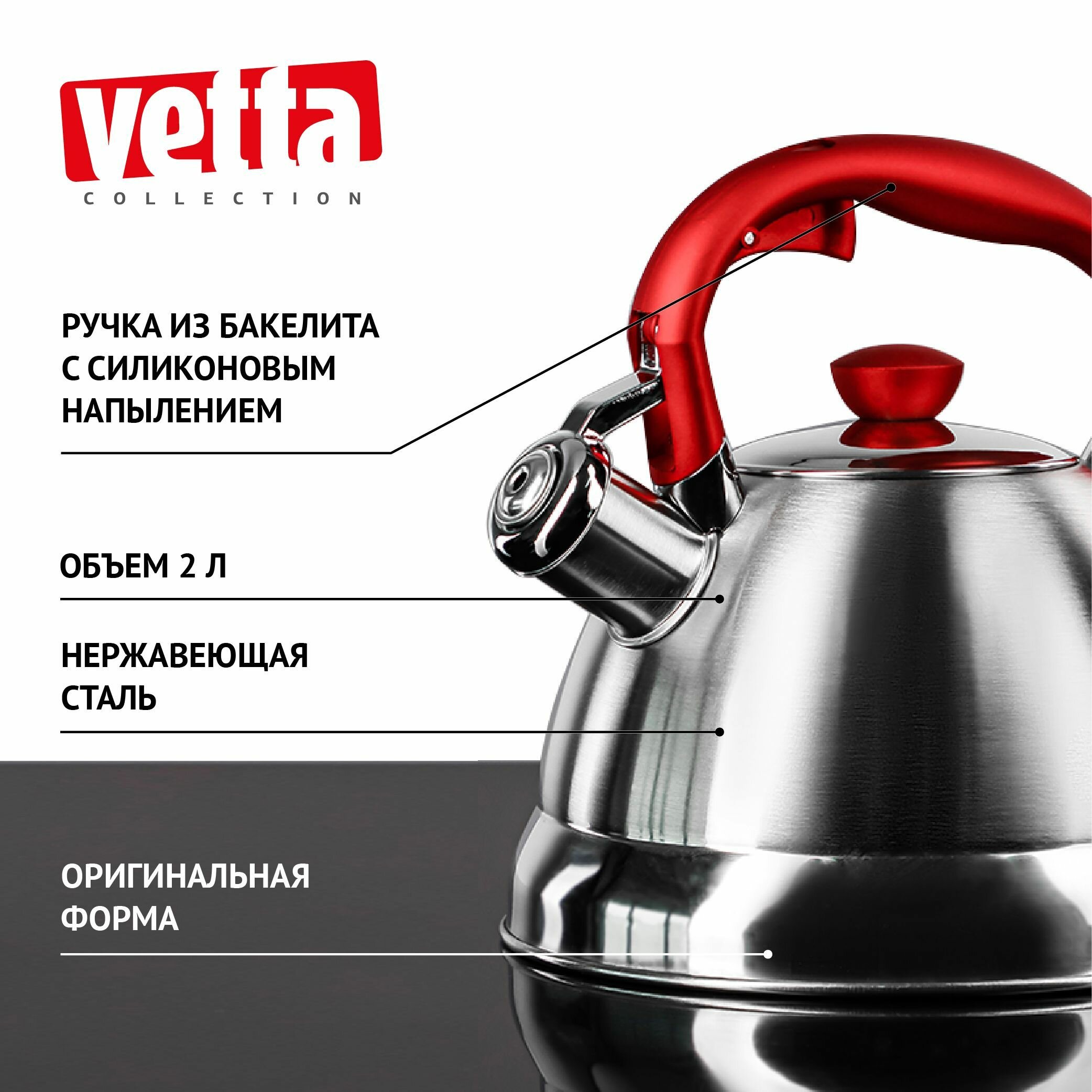 Чайник со свистком VETTA 847-067 Верда 2,0 л, серебристый/красный