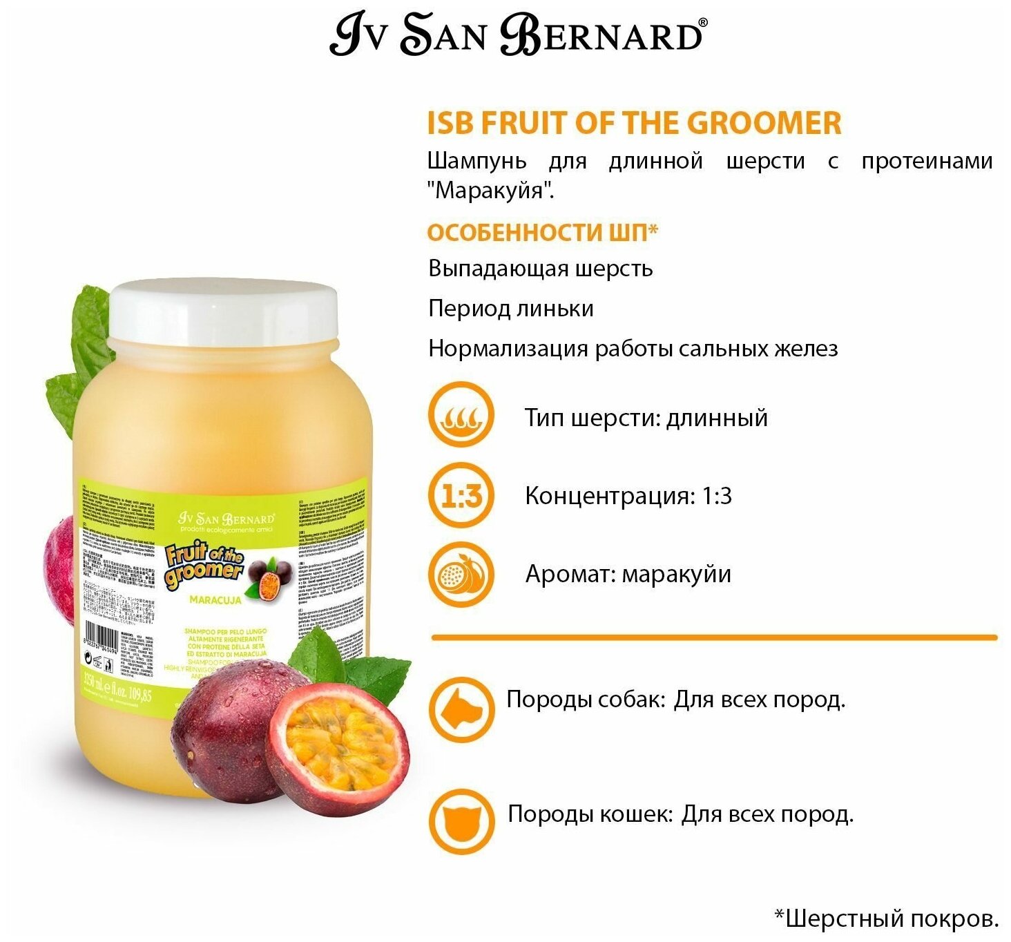 IV SAN BERNARD FRUIT OF THE GROOMER MARACUJA SHAMPOO шампунь Маракуйя с протеинами для длинношерстных собак и кошек (500 мл)