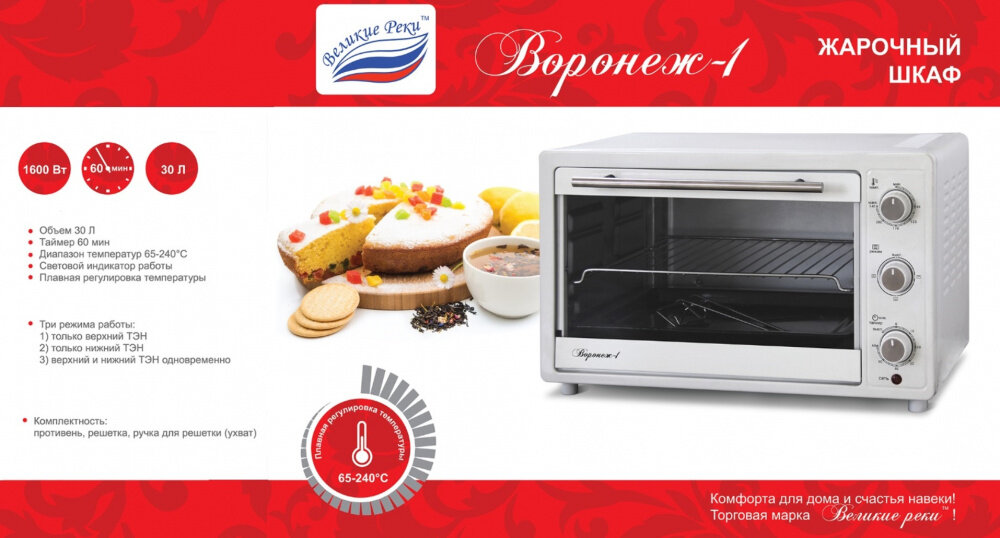 Электрическая духовка Великие Реки Воронеж-1 белый,1600 Вт,30 л,таймер 60 мин,выбор работы ТЭНов,бел