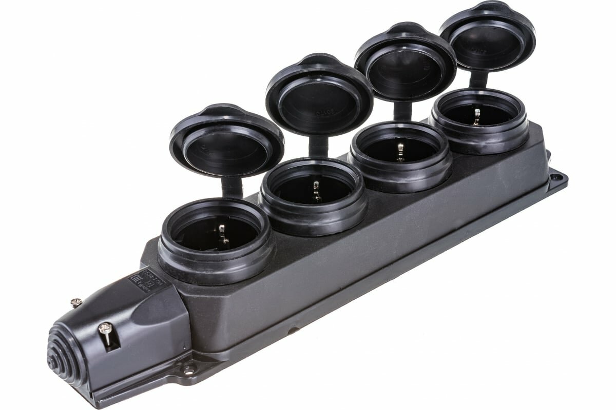 Колодка розеточная IEK Омега, 4 гнезда, с крышками, с заземлением, 16 А, IP44, черная