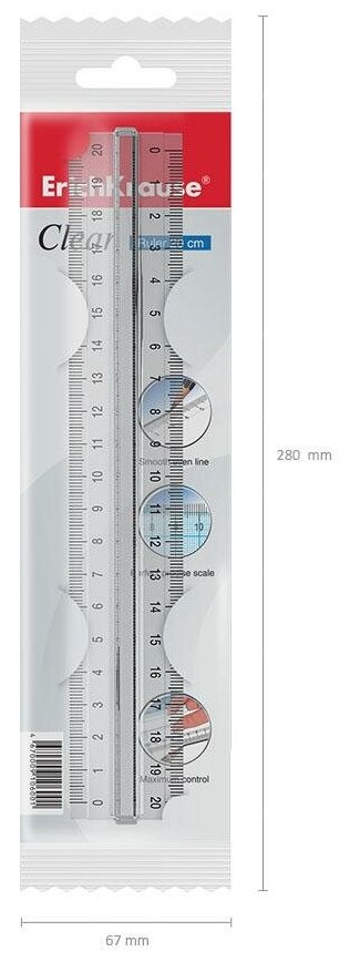 Линейка с держателем 20 см, ErichKrause Clear, прозрачная, пластиковая, во флоупаке
