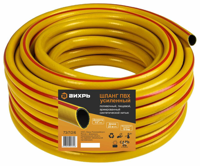 Вихрь Шланг поливочный ПВХ усиленный, пищевой трехслойный армированный 1/2, 25 м жёлтый 73/7/2/6 .