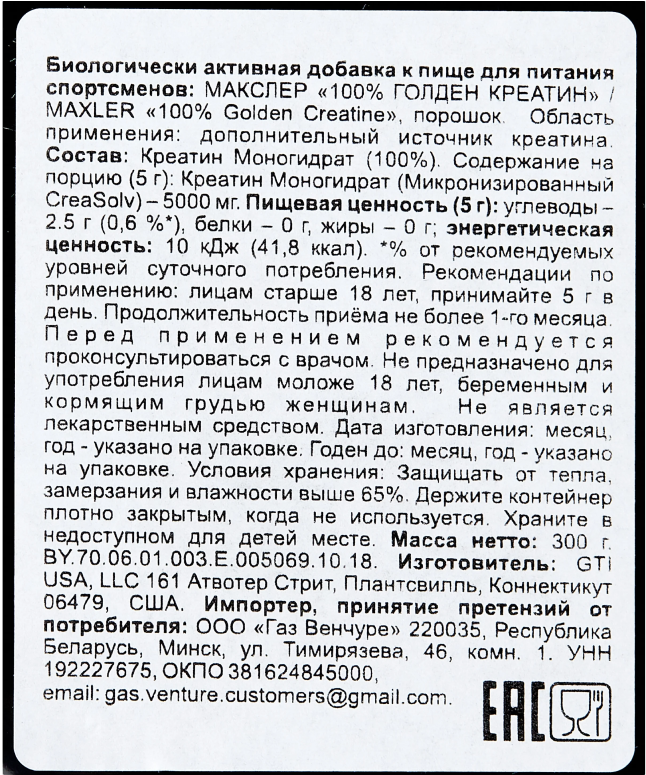 Креатин Maxler 100% Golden Creatine (300gr) банка . нейтральный