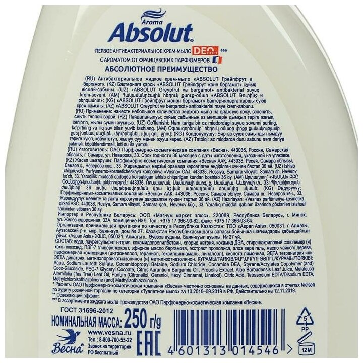 Весна Мыло-крем жидкое"Абсолют"антибактериальное, грейпфрут и бергамот 250мл