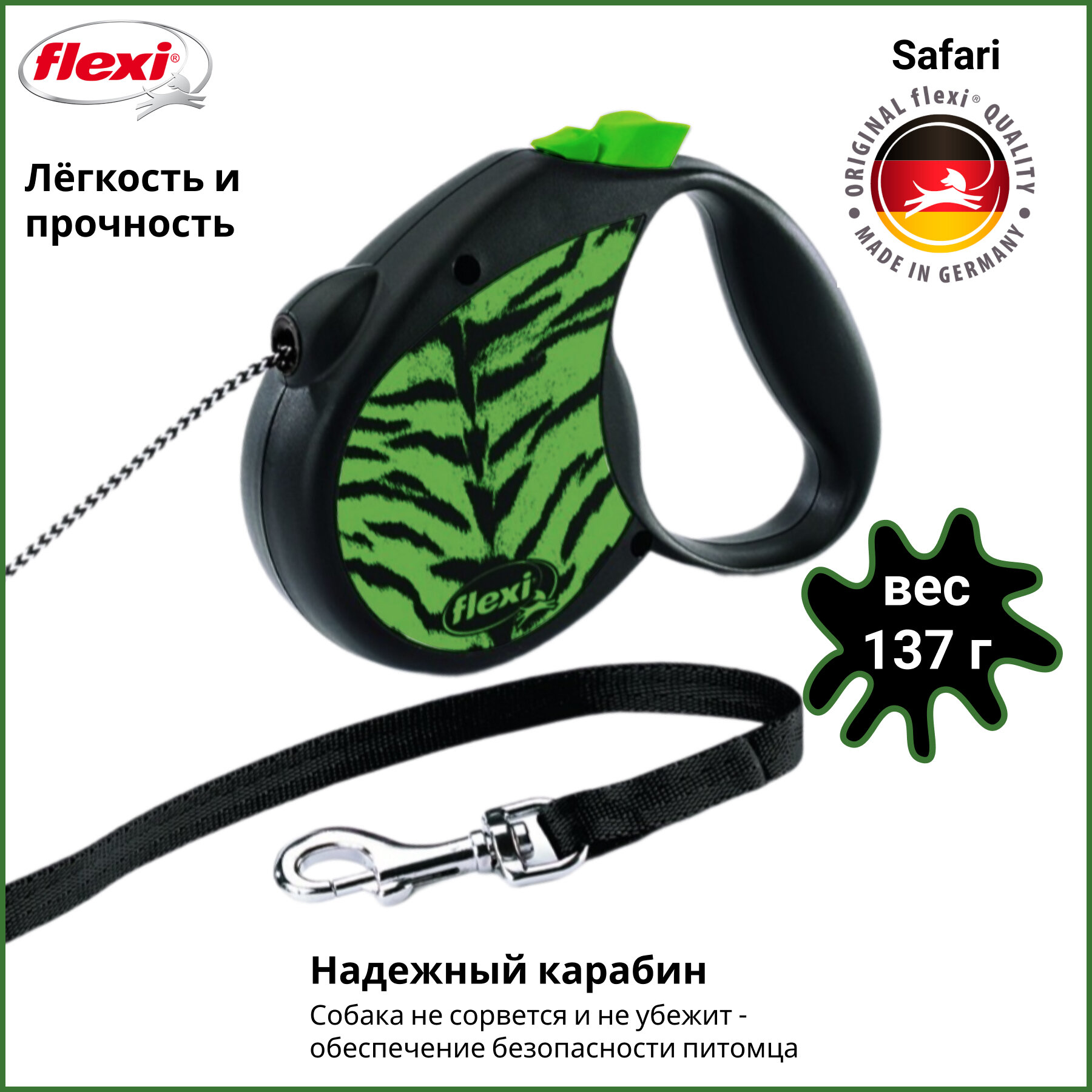 Ниже Вы можете прочитать отзывы на Поводок-рулетка Flexi Safari tiger S, 5 м, 12 кг, зеленый принт, ознакомится с подробными характеристиками, посмотреть интересные обзоры и фотографии на Поводок-рулетка Flexi Safari tiger S, 5 м, 12 кг, зеленый принт.