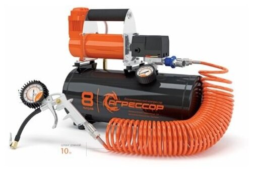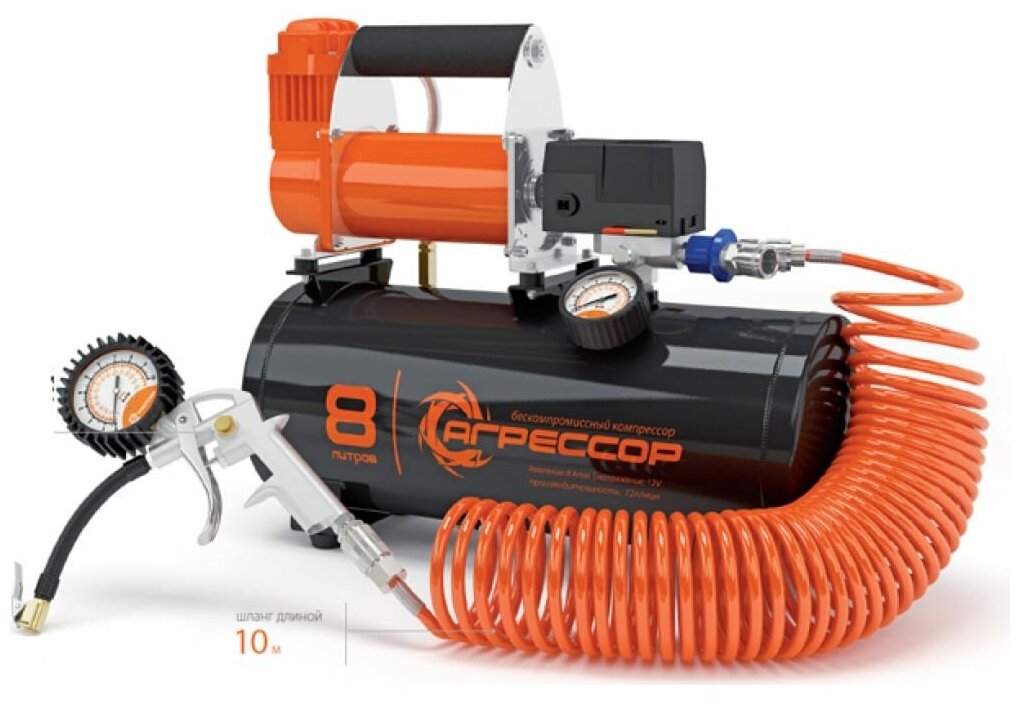 Купить Агрессор Компрессор Агрессор, металлический, ресивер 8л., 12V, 480W, шланг 10м., пистолет для накач.