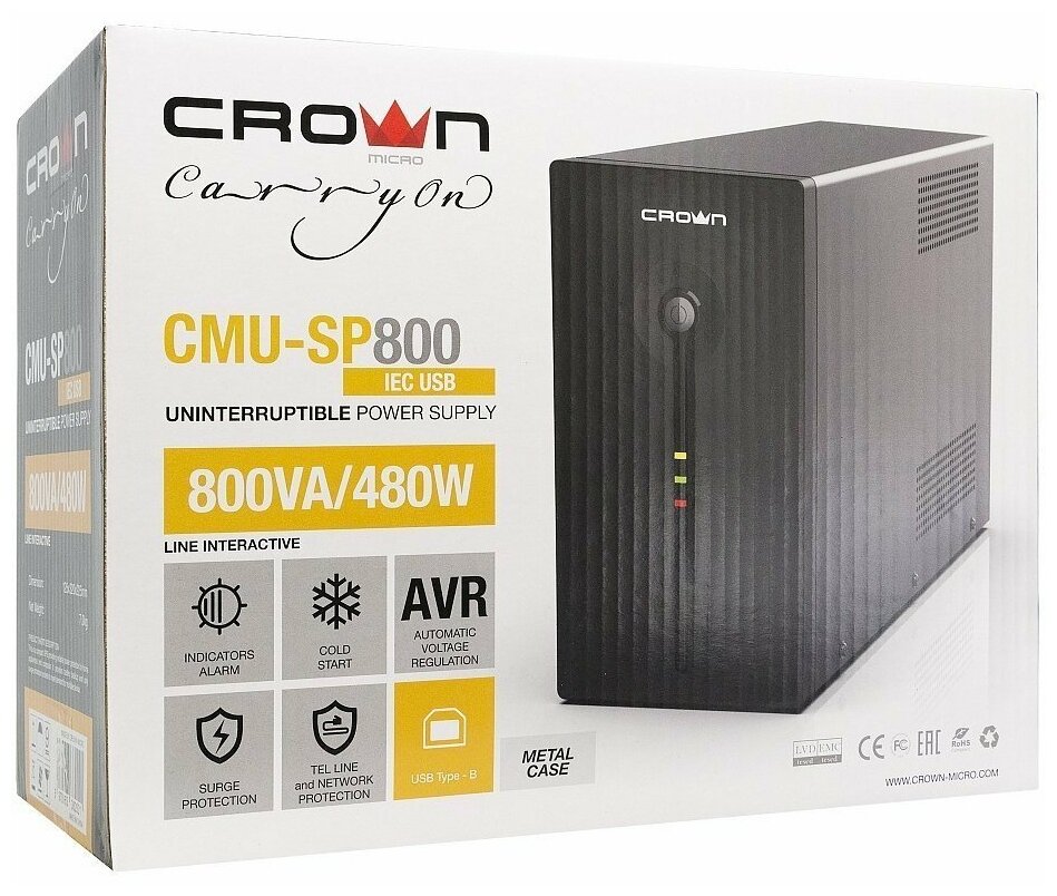 Источник бесперебойного питания CROWN Line Intractive CMU-SP800IEC LCD USB 800VA\480W, корпус металл, 1x12V/9AH, розетки 8*IEC, трансформатор AVR 140-290V, LCD-дисплей, cъёмный кабель 1.2 м, порт RJ11/45, порт USB, защита: от перегрузки, от КЗ, от скачков