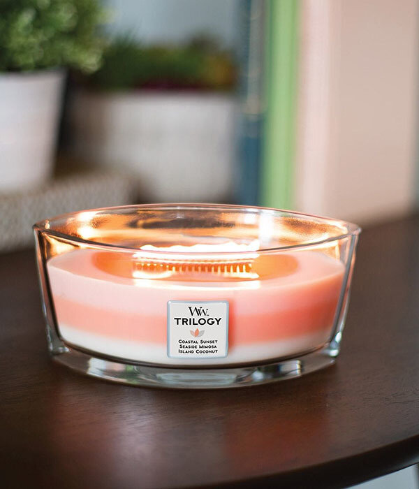Свеча WoodWick Trilogy Island Getaway (Coastal Sunset, Seaside Mimosa, Island Coconut) (76967), эллипс розовый/белый