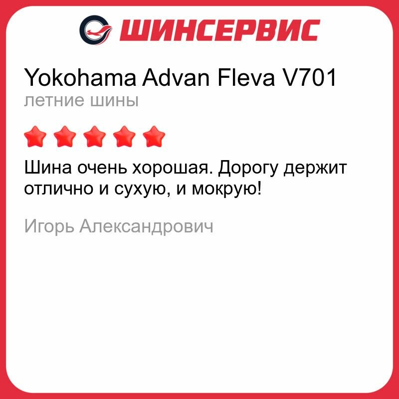 | Отзыв: | Прошлым летом поставил на свою Volvo YOKOHAMA ADVAN FLEVA V701. Нравится управляемость, сцепление с дорогой отличное, при торможении и на поворотах на мокрой дороге ведут себя хорошо, не проскальзывают, тормозной путь не увеличивают. Рисунок протектора разнообразный, что обеспечивает дополнительное сцепление. Что еще понравилось - шины не шумные, приятно ездить без дополнительного шуршания в салоне. По соотношению цена-качество тоже отличный вариант, не очень дорогие, и при этом надежные. |