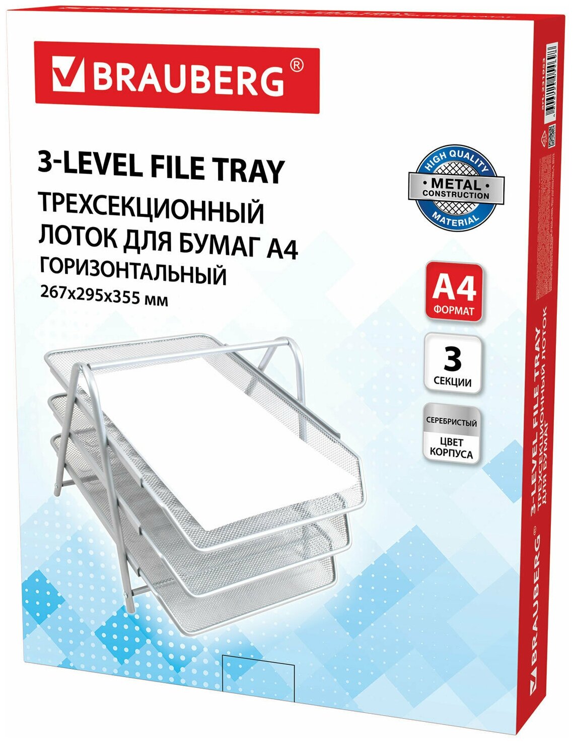 Лоток горизонтальный металлический для бумаг, 3 секции, BRAUBERG "Germanium", А4 (267х355х295 мм), серебристый, 231953 В комплекте: 1шт.