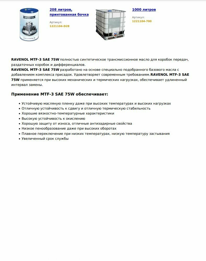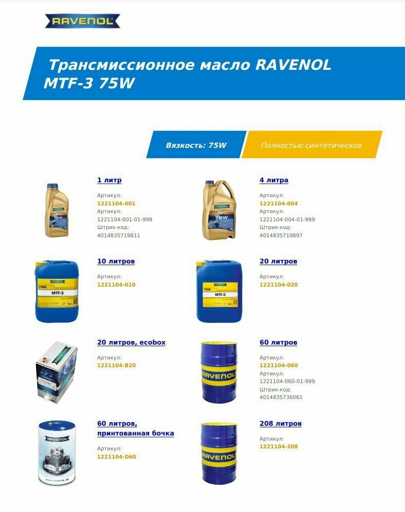 Трансмиссионное Масло Ravenol Mtf -3 Sae 75W 1Л Ravenol арт. 1221104-001-01-999