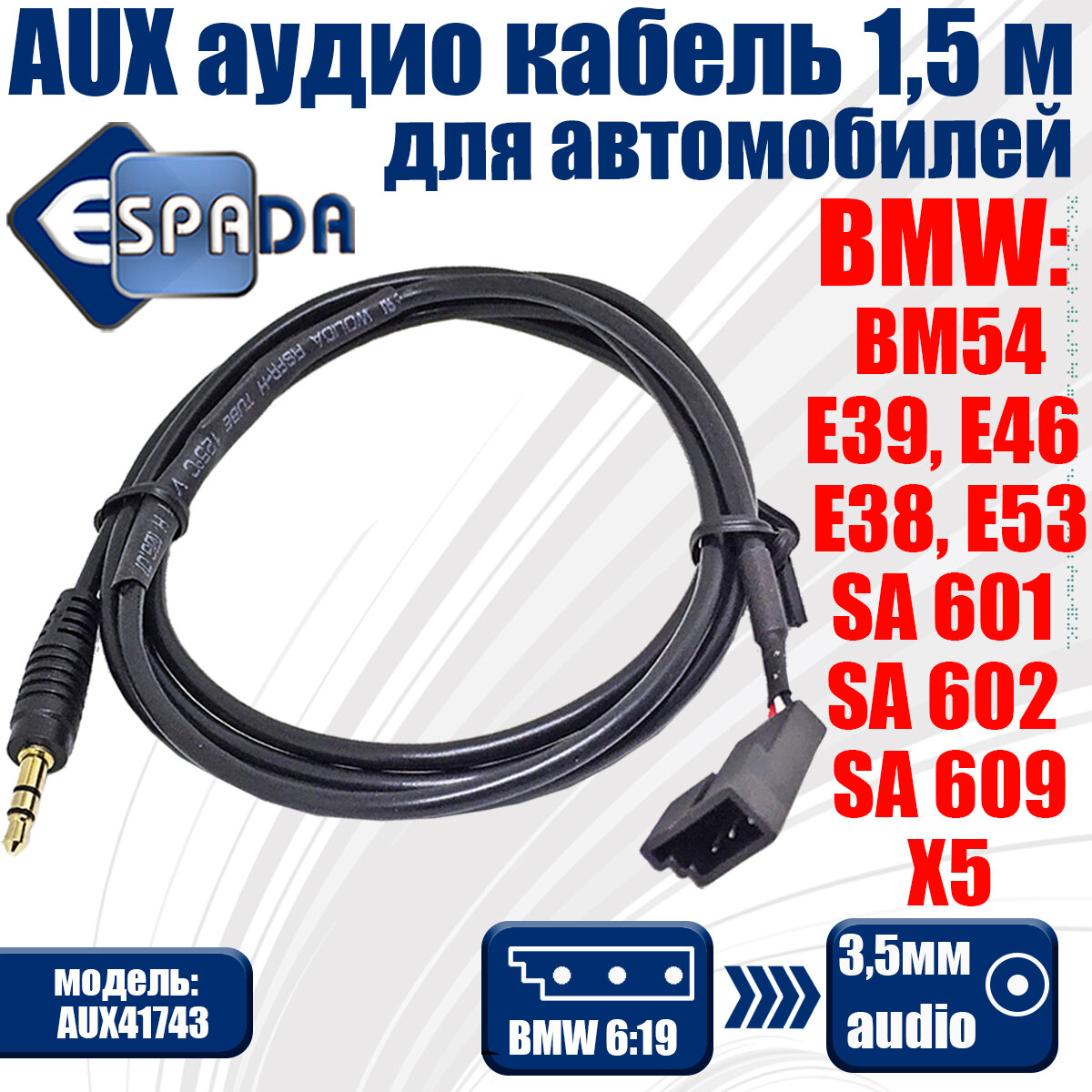 Espada AUX to 3.5mm Audio Female 1.5m для BMW BM54/E39/E46/E38/E53/X5/SA 601/SA 602/SA 609 AUX41743